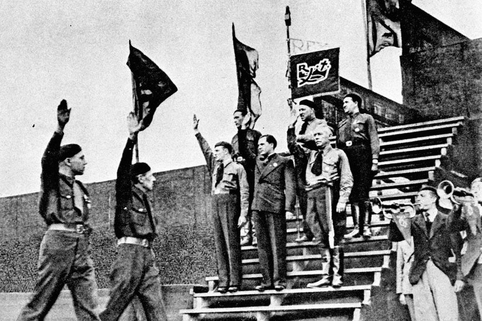 Zgromadzenie Verdinaso w 1932 roku. W tamtym czasie organizacja składa się głównie z milicji. Nie bierze udziału w wyborach. Jej postulaty nie znajdują powszechnego poparcia poza Flandrią. Źródło: belgiumwwii.be.