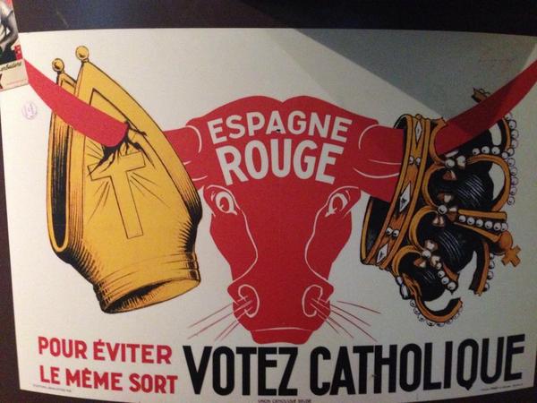 Plakat wyborczy Bloku Katolickiego  w 1936 roku. Hasło głosi: „aby uniknąć tego samego losu (co Hiszpania), głosuj na katolików”. Partia Katolicka w koalicji z socjalistami stała na czele belgijskiego rządu przez ponad 30 lat. W 1921 roku przekształcona w Unię Katolicką, w 1936 roku w Blok katolicki. Po II wojnie światowej jej następcą stała się w Chrześcijańska Partia Społeczna (chrześcijańsko-demokratyczna). Źródło: Wikimedia.