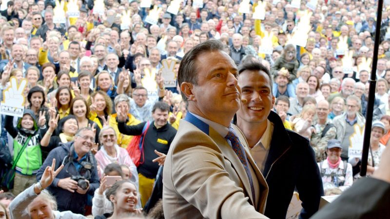 Na pierwszym planie przewodniczący Nowego Sojuszu Flamandzkiego, Bart De Wever podczas wiecu wyborczego w 2019 roku. De Wever zasłynął niegdyś sugestią, by „pozwolić Belgii wyparować”. Zajął drugie miejsce w siódmej edycji bardzo popularnego w Belgii quizu „Najmądrzejszy człowiek świata’’, co przyczyniło się do przychylnego spojrzenia na tego młodego stażem i wiekiem polityka.