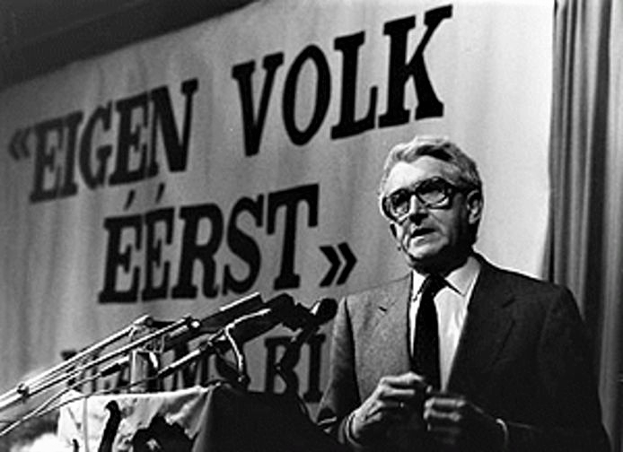 Karel Dillen podczas jednego z przemówień. W tle hasło ,,najpierw nasi ludzie’’. Źródło: De Provinciale Zeeuwse Courant.