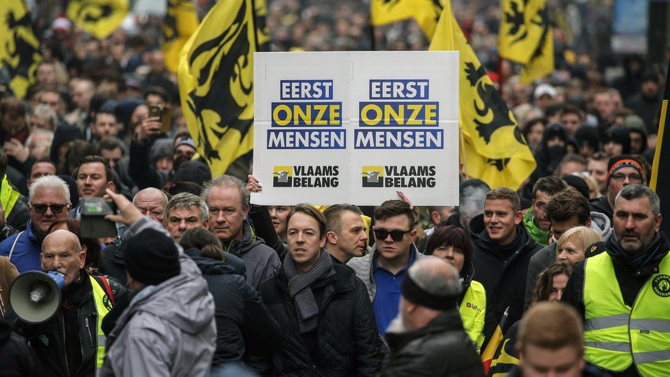 Poprzedni belgijski rząd upadł w grudniu 2018 roku na skutek protestu N-VA przeciwko ratyfikacji Paktu Migracyjnego ONZ z Marakeszu, w którym brała tez udział Partia Vlaams Belang. Na zdjęciu przedstawiciele VB w Brukseli z transparentami z hasłem ,,Najpierw nasi ludzie’’. Sformułowanie kolejnego rządu trwało ok. 600 dni. Źródło: Vlaams Belang.