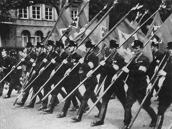 Rok 1938. Przemarsz strzałokrzyżowców na ulicach Budapesztu. Źródło: Wikimedia.