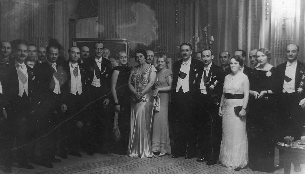 Wizyta Gyuli Gömbösa w Polsce w 1934 roku. Widoczni w pierwszym rzędzie m.in. premier Leon Kozłowski (2. z lewej), premier Gyula Gömbös fa (3. z lewej), minister Józef Beck (4. z lewej), Karol Romer (1. z prawej), minister Wacław Jędrzejewicz (4. z prawej), Jan Szembek (5. z prawej), minister Tadeusz Kasprzycki. Źródło: Wikimedia.