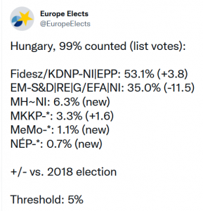 „Odnieśliśmy wielkie zwycięstwo. Tak wielkie, że widać je nawet z księżyca, a już na pewno z Brukseli. (…) Nie pozwoliliśmy na powrót haniebnej przeszłości, obroniliśmy niezależność i wolność Węgier, obroniliśmy ich pokój i bezpieczeństwo” – mówił Viktor Orbán po wygranej koalicji Węgierskiej Partia Młodych Demokratów (Fideszu) i Chrześcijańsko-Demokratycznej Partii Ludowej (KDNP) w wyborach parlamentarnych na Węgrzech, które odbyły się 3 kwietnia. To czwarta z rzędu wygrana połączonych sił tych dwóch partii.