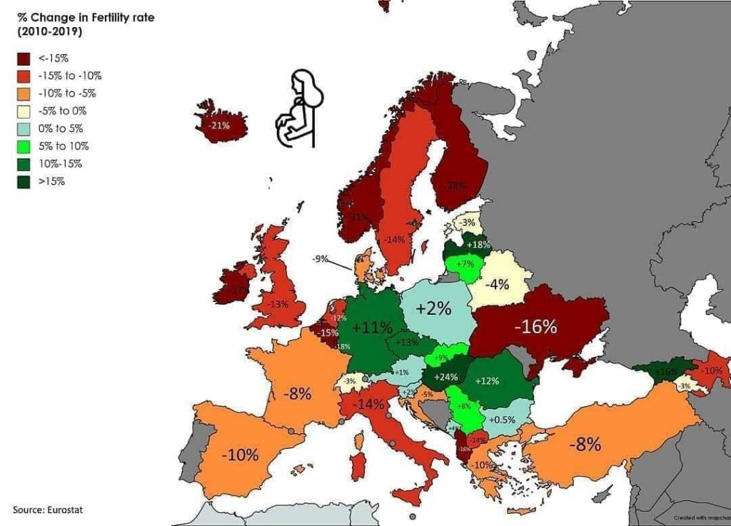 Badanie, jak zmienił się poziom urodzeń w europejskich krajach w latach 2010-2019. Węgry z największym przyrostem wśród analizowanych państw. Źródło: Eurostat.